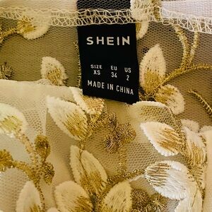 Guttering leaves of gold on the bodice. Side zipper opening . Approximately 12 inches across the bottom hem laying flat. Adjustable straps. Polyester. Bra cups are lined. No padding.