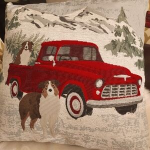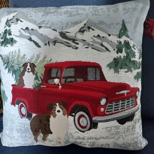 Winter mountain holiday pillow with textured embroidered front and grey/blue velour back. The pillow is machine made but very tastefully done with attention to detail. Two collies loading up with a Christmas tree on a snowy day with picturesque mountains in the backround. The cover is removable , New with tags no rips or stains.