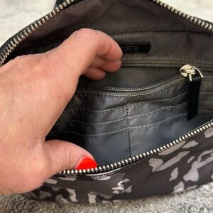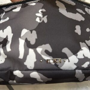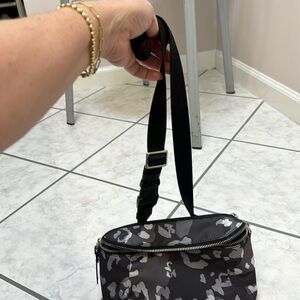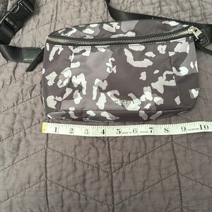This is a gray black-and-white camouflage to me fanny pack/waist pack. it has absolutely never been used. The main compartment is large. It has a zipper pocket and a space for six credit cards back has a pocket and then there is another pocket with a magnet.
