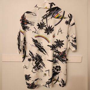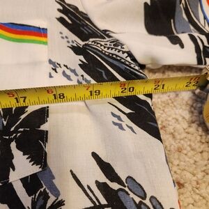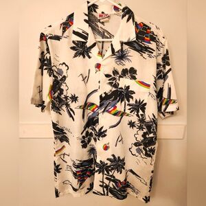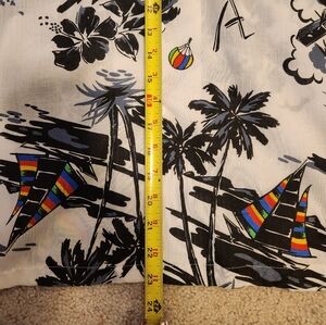This absolutely awesome white, short-sleeve Hawaiian button-down shirt is from the late 70s/early 80s and features various nautical motifs, including sailboats, ships, palm trees, and islands. Splashes of rainbow colors add flair and pizzaz to the piece.