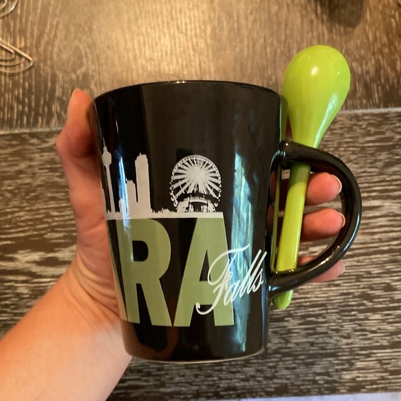 Niagara Falls-Black and Green Coffee Mug, with a convent spoon in the handle.