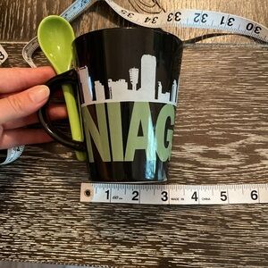 Coffee Mug, Black and Green with Niagara Falls written across the front and a convent spoon in the handle.