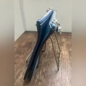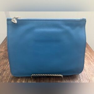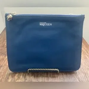 Very unique and super cool piece from Alexander McQueen. Two buttery soft royal and light blue leather pouches connected together each with silver skull hardware. Shows minimal wear throughout and interior very clean. Can add a chain to make into a crossbody if desired.