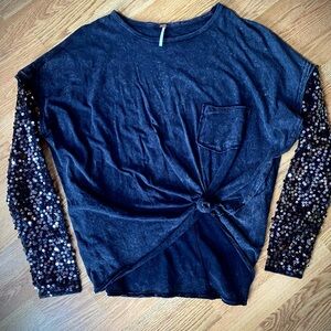 Free People Washed Black Shirt with Sequin Sleeves. Lightly worn. Size small but feels like an XL. Baggy style.