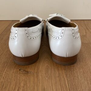 Celine white tasseled loafers/brogues. Almond toe style. Heel is about .75”. Contrast tan/brown soles. There is a mark on the inside toe area of right shoe as seen in photos but otherwise in excellent condition! No box.