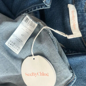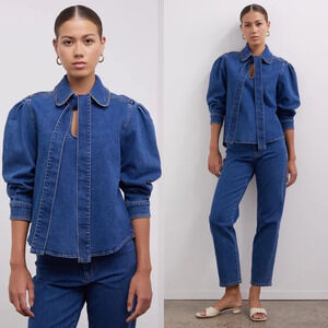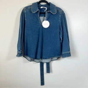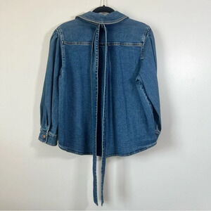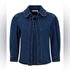 SEE BY CHLOE Tie-Neck Shirt Denim Jeans Blouse Top Preppy Puff Sleeve US 8