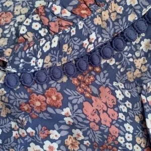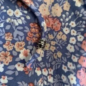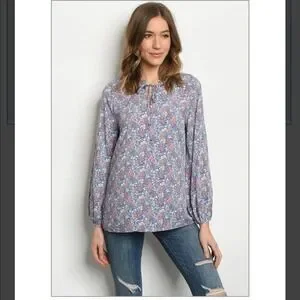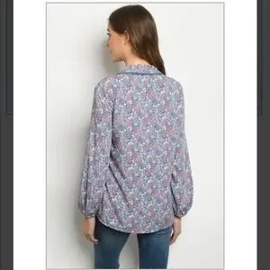 NEW in packaging, Long Sleeve Blue Floral Ruffle Trim Collar Top Size Small. Tie-neck with silver detail on string. Colors are blue, white, pink, nude. Made in China: 100% rayon. Hand wash & line dry. All measurements are approximate:
