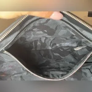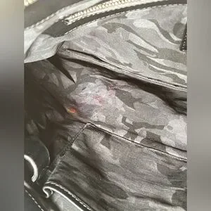 Corners. It does not include strap but does have a D ring if you want to convert it into a wristlet. Silver hardware with scratches. There is lots of space to carry all your needs! There is red stain in the interior (not sure what it is, maybe it can be cleaned)