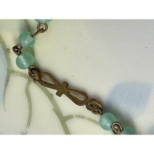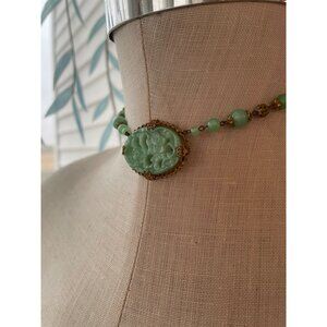 A stunning vintage 1930s pendant featuring green molded Peking glass beads and uranium beads. Perfect for collectors and vintage jewelry enthusiasts. The clasp on this is signed for Czechoslovakia. The pendant measures 1 3/4x1" and the necklace measures 15". The four round beads glow for Uranium but the rest does not. The brass is minorly aged but still has a nice gold gilt to it. Overall in good wearable condition.