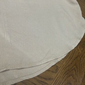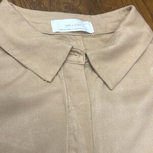 Size SM Oversized OAK + FORT 100% Viscose Blouse in EUC . This is in a tan colour and is very soft and comfortable. Collar with button closure hidden down the front leading to a rounded hem. Versatile piece that could be worn open , with a shirt or blouse u Fenway, belted or by itself. Centre seam down back of shirt. Relaxed drop shoulder . No discolouration or pilling.