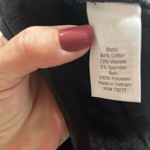 Lauren Conrad black velvet, belted slacks with a flattering front seam and ribbon style belt to add elegance. The length is perfect for me and I am 5’2”. Please see pictures for measurements. Made of a cotton blend with a little bit of stretch. Please ask any questions before purchase. Perfect for the Holidays!!