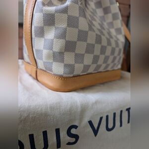 The Louis Vuitton Noé BB is a smaller version of the iconic Noé bag, known for its bucket shape and distinctive drawstring closure. It's crafted from LV's signature Azur Damier canva and white vachetta featuring a spacious interior and adjustable shoulder strap for versatility. The BB size is compact yet practical, making it suitable for everyday use while still exuding elegance and style.