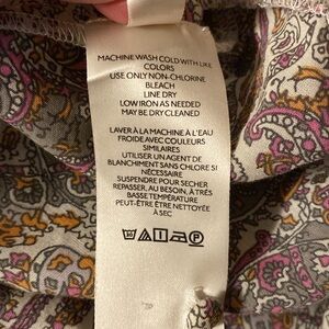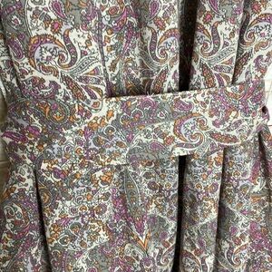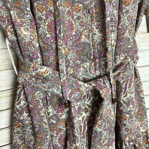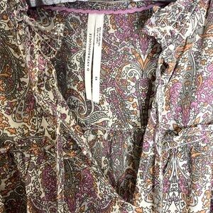 Anthropologie Paisley Button-front Dress with matching sash. Size XS. Cotton blend. Lightweight with long peasant sleeves with elastic at the wrists. Fabric covered buttons all down the front. Ruffled collar. V-neck with tie at the neck. Excellent pre-owned condition. Material and care instructions included in the pictures. Approximate dimensions when laid flat: Length- 33.5”, Chest- 18”, Sleeve (shoulder to cuff)- 23”.