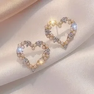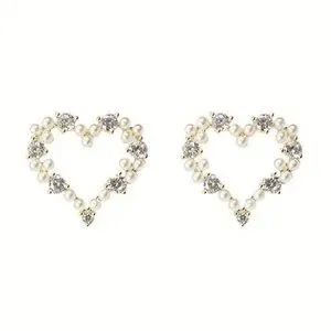 Add a bit of sparkle to your outfit with these stunning faux pearl and simulated diamonds heart gold toned stud earrings.