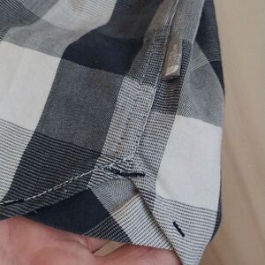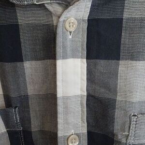 Navy and white block plaid button up short sleeve shirt. Two front button pockets.