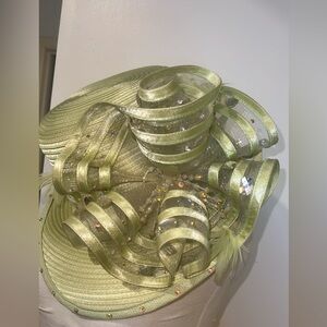 Vintage ML STUDIO Mint Green Hat Rhinestones Feathers one size