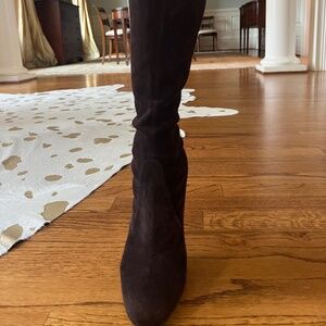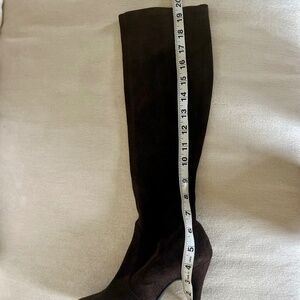 Worn once and in excellent condition. No signs of wear or marks. This beautiful pair of chocolate brown knee high suede boots has a 4 inch covered heel and an almond toe. It is a pull on boot crafted from stretch suede for a close fit, has a leather insole, and a rubber sole. Made in Spain.