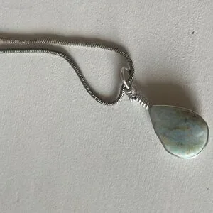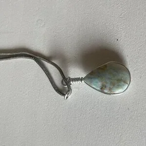 A beautiful and large Larimar stone pendant on a silver chain. Owned for several years but never worn, in new condition. Authentic and purchased from the Dominican Republic.