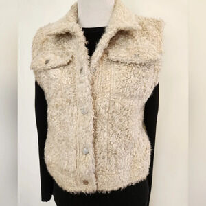 Off white, furry vest in size small by Gap. This has chest pockets, and metal snap closures. I loved the straight lines of this piece. I wore it over dresses.
