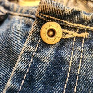 These vintage jeans, made in the USA, showcase a unique cut-out design with side tabs. Crafted from 100% cotton, they offer both style and comfort.