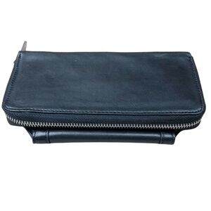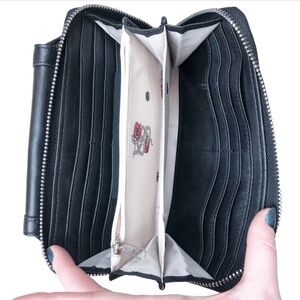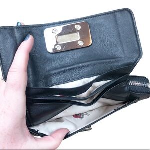 Rough Roses Black Wallet Clutch. Zip closure with outside pocket & turn to lock closure. Multiple card slots. Inside change pocket with zip closure. Great pre-loved condition.