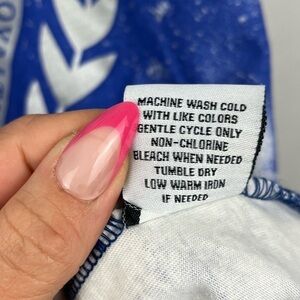 Rise as 1ne Mens short sleeve graphic shirt. Crew neck. Blue and white color. Cloud like print. Rhinestones. Logo on sleeve. Pull over. 60% cotton, 40% polyester. Machine washable.