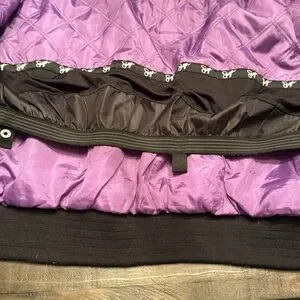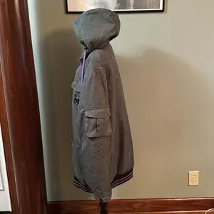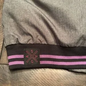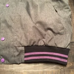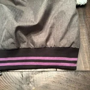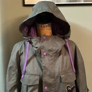 Saga Outwear gray hooded ski jacket with purple inside lining. Two front breast pockets. Zips and snaps up the front. Two back side vents that zip up and down.