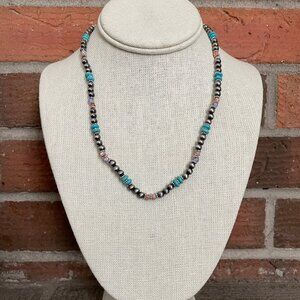 Navajo Style Pearl Necklace with Turquoise, Orange, & Purple