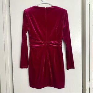 NWT. Aqua velvet rosette bodycon mini dress. Color is like a deep Magenta. V-neckline, back zipper closure, long sleeves, padded shoulders, bodycon style. Adorable little rosette detail on the front waist. Lined. Size S.