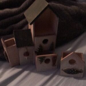 Cute birdhouse which can be used for storage for small items in a bedroom or bathroom( i kept q tips and earrings in them:) The birdhouse is about 6 or 7 inches tall.