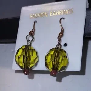 Lightweight and translucent beautiful chartreuse green colored faceted beads on bright copper fish hook wires.