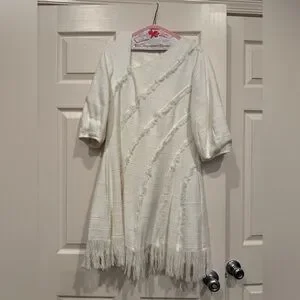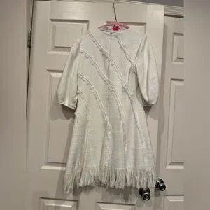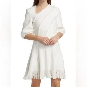 Fringed trim adds dimension to this bouclé puff-sleeve mini dress.