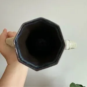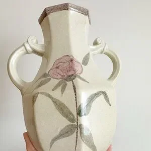 Elegant cream vase with pink floral design. Features dual handles and a hexagonal rim. Great condition, no chips or cracks.