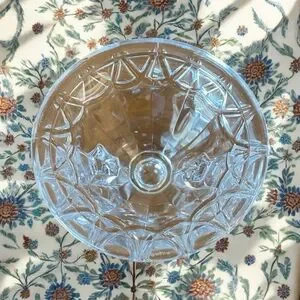 Imperial Glass “Crocheted Crystal” pattern. Pressed glass, mint condition, no chips or cracks measures 4.50” at the widest point x 4.25 x 4.38”.