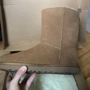 Good used condition, minimally worn, UGG Classic short with zip. Size 9. Very minimal wear on inside. Some minor scuffing in multiple places on outer. What appears to be some slight salt line on right shoe.