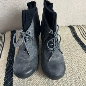 Dr. Scholls Women's Ali Elephant Ankle Boots in Gray Suede Leather. This women's ankle boot is set in an oiled leather upper in a casual round toe silhouette. A knit detailing a fold over cuff lends a unique look while a lace up closure allows for an adjustable fit. Flexible, lightweight, and minimalist construction with massaging gel insoles and a flexible outsole for unhindered forward motion, a natural foot strike, and a soft fit that shapes to the foot. Slip into ultimate comfort and style with the Dr. Scholl's Ali.