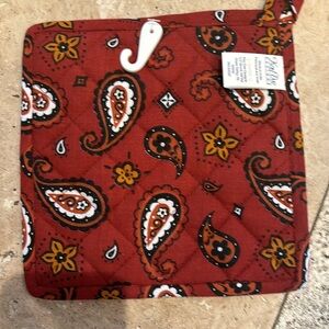 Dish towel is 18”x 28” and pot holder is 8”x 8”. For western kitchens or outside barbecues.