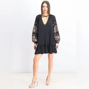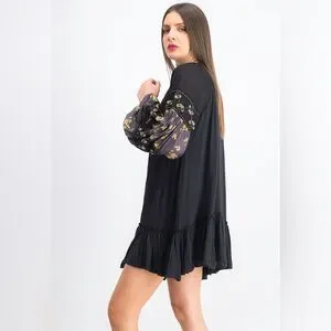 An intriguing fusion of relaxed and elegant, this lightweight tunic from Free People features a mix of prints, embroidery, and beading, at the flowing ballooning sleeves that unbutton at the wrists. Tassels in the front with option to tie. Material: Lyocell, linen
