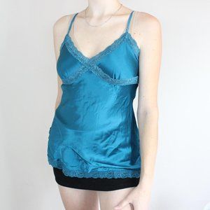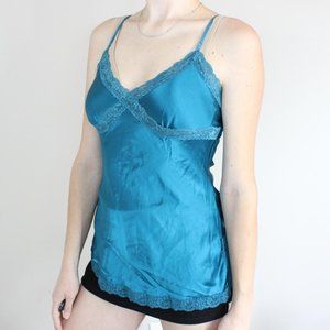 Stunning lingerie lace cami in a gorgeous jewel tone blue green with a lace trim babydoll bust. Fitted silhouette, super flattering design. Fabric is smooth and shiny. Has adjustable straps.
