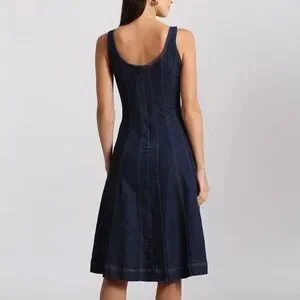 Flattering vertical seams add dimension to our fit-and-flare stretch denim dress, which features an elegant dark wash, classic brown stitching, back zipper closure, and a breezy, unlined interior β¨