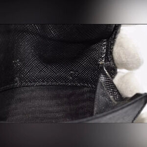 Keywords: Prada, card wallet, black, leather, unisex, credit card holder, logo, solid pattern, pre-owned, designer accessory.