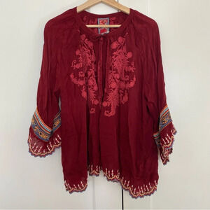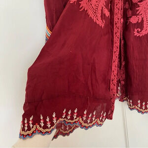 About the brand: Eclectic, Boho vibes with a vintage flare. Nasiba Blouse in garnet with self-tie neck detail and embroidered design Approximately 24in from shoulder to hem Model is 5'9 and is wearing a size small. Measurements may vary slightly by size. 100% rayon Machine wash Imported