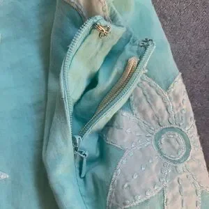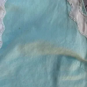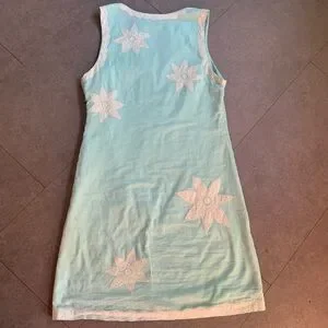 This gorgeous dress is perfection! It's light blue and has beautiful sewn in flower details. The cotton makes this a breathable fabric and there is a zipper/ hook and loop closure. This would go perfect with some leather boots or gogo boots. This is a flawed gem; imperfections are shown in the last three photos.