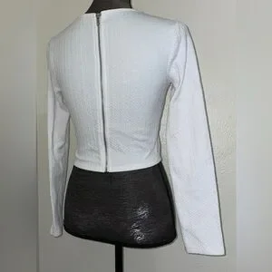 This item is a Forever 21 brand white long sleeve crop top. The size is a women’s small and it fits true to size, it is stretchy material. It is white in color with a textured feel to the fabric and a zipper down the back. There is no damage to the item.