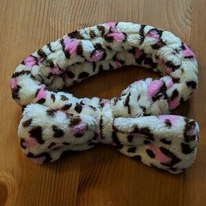 Fuzzy white with pink and black leopard print hairband. Perfect for keeping hair out of face when doing skincare.