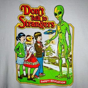 In Excellent Condition, Don't Talk to Strangers Alien Safety Education T-Shirt By Steven Rhodes in Size 2XL. Color Beige.