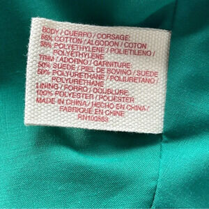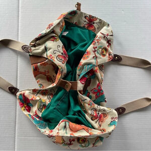 This bag is in very good pre-owned condition. See pictures to the bottom interior lining and side exterior.This bag is large and unique and will carry a lot of stuff!See measurements in pictures. Colorful Floral & Print Print Green Piping trim on lower Front & Back Back Pocket and lower suede trim Signature LUCKY BRAND name plate on front Durable Double Shoulder Straps with Faux Leather & Gold tone hardware Open Top with double Strap Closure - Clasp/Ring & Snap ClosureCan be clasped to be smaller or opened to be larger. Green Cotton Lined Interior Inside has 2 Slip Pockets & a Zipper Pocket