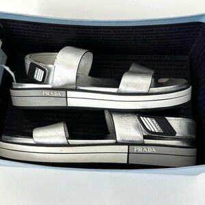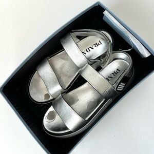 PRADA SPORTY METALLIC SILVER OPEN TOE SANDALS FLATFORM SHOE SIZE 39/ US 8.5~ Made in Italy.
