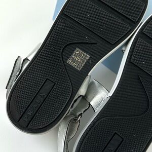 Gorgeous Designer sandals with metallic silver foil design, double strap leather upper, and rubber platform with adjustable strap ankle strap. Authentic Designer pair! Stylish and comfortable for all-day wear.