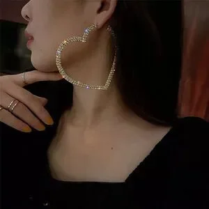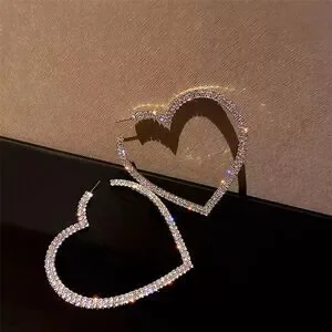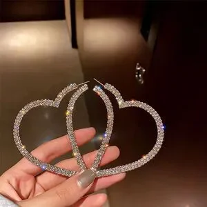 OS006 STUNNING DIAMOND SILVER TONE LARGE HEART HOOP EARRINGS